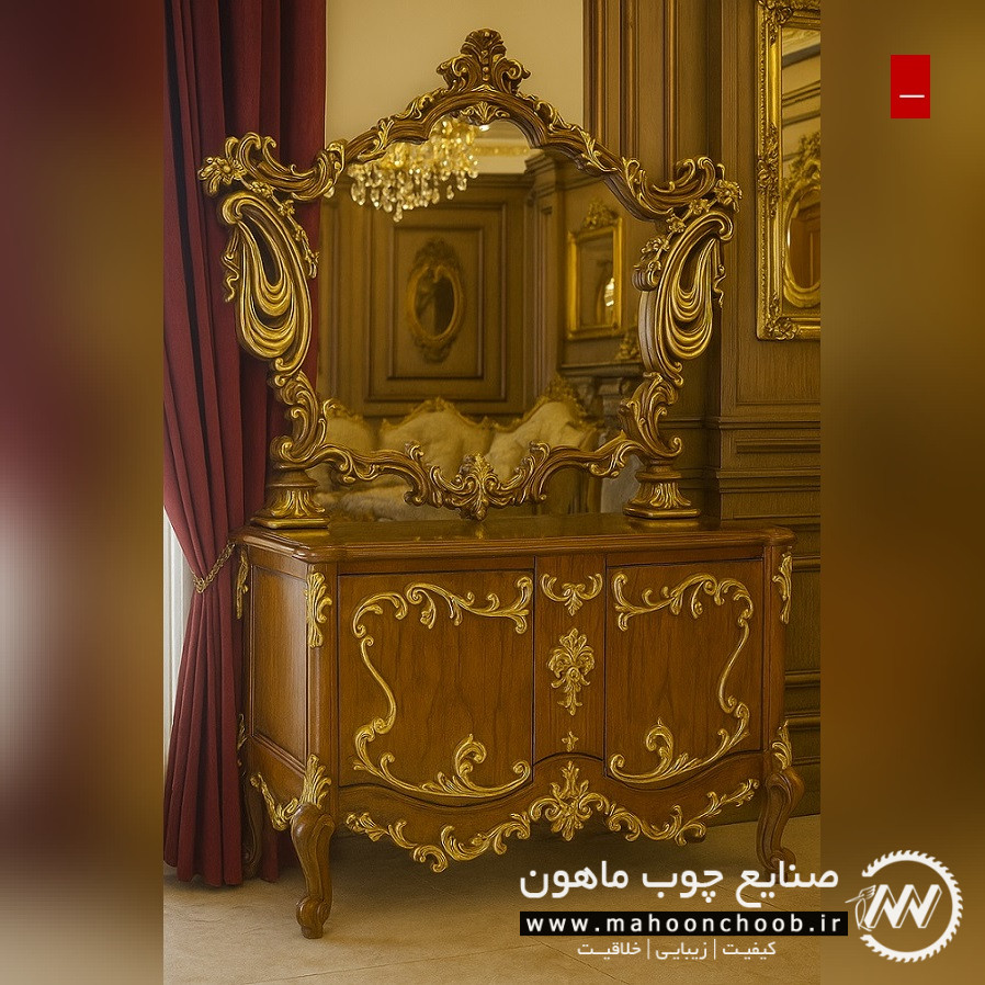 آینه و کنسول سلطنتی آرال از مدل های کلاسیک و لوکس است و به جهت طراحی شیک و منبت کاری زیبا جز کارهای پرطرفدار مجموعه ی ماهون چوب می باشد.