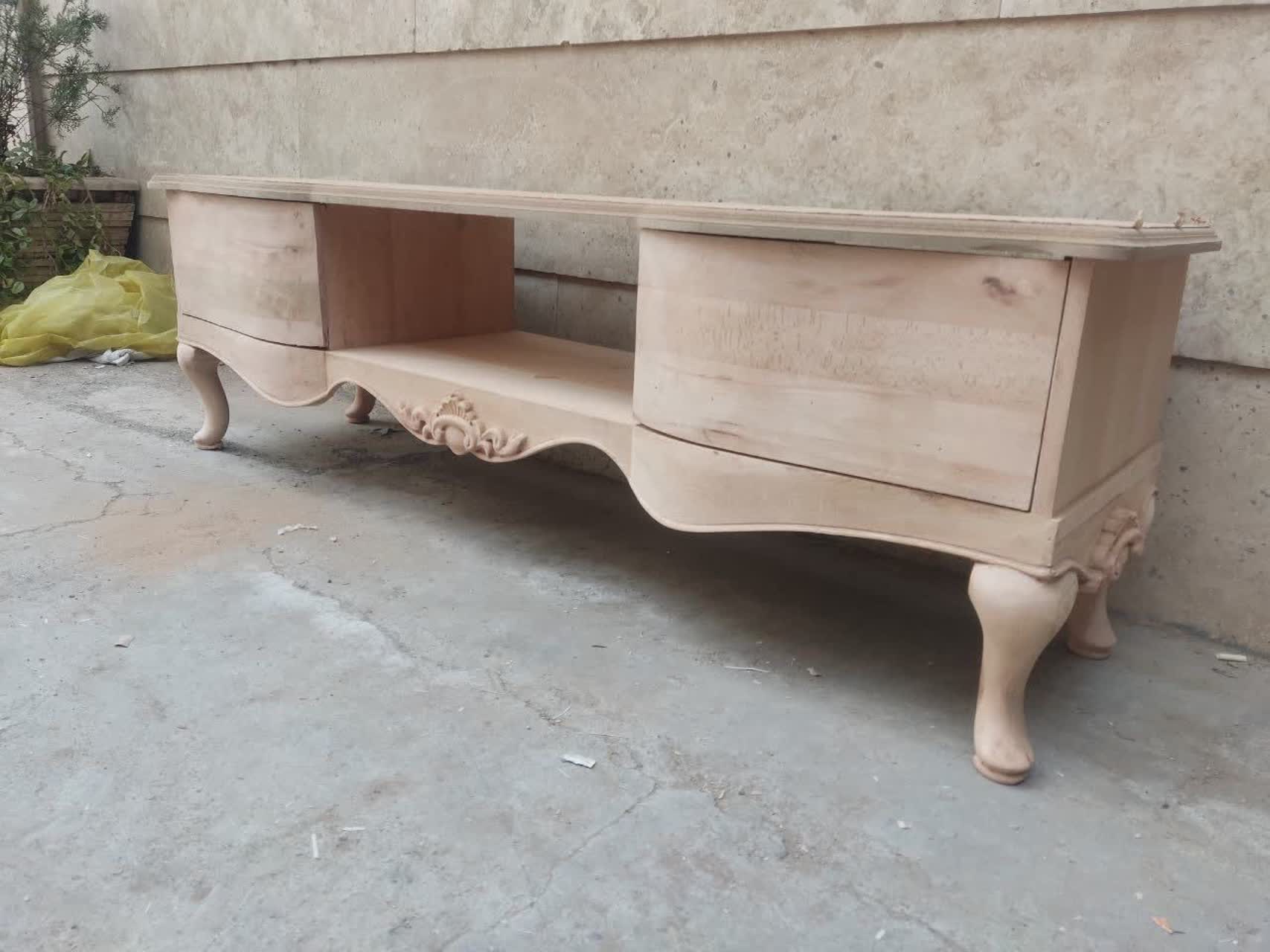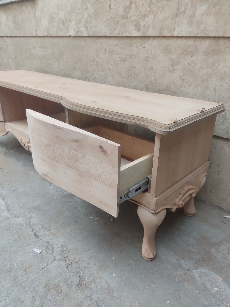 طاولة تلفزيون مودرن بطول 160 سم مستوحاة من رشاقة الغزال. تتميز بأرجل “سم آهو” الشهيرة ونقوش بسيطة جداً. مصنوعة من خشب الزان عالي الجودة وتُباع خام بدون طلاء.