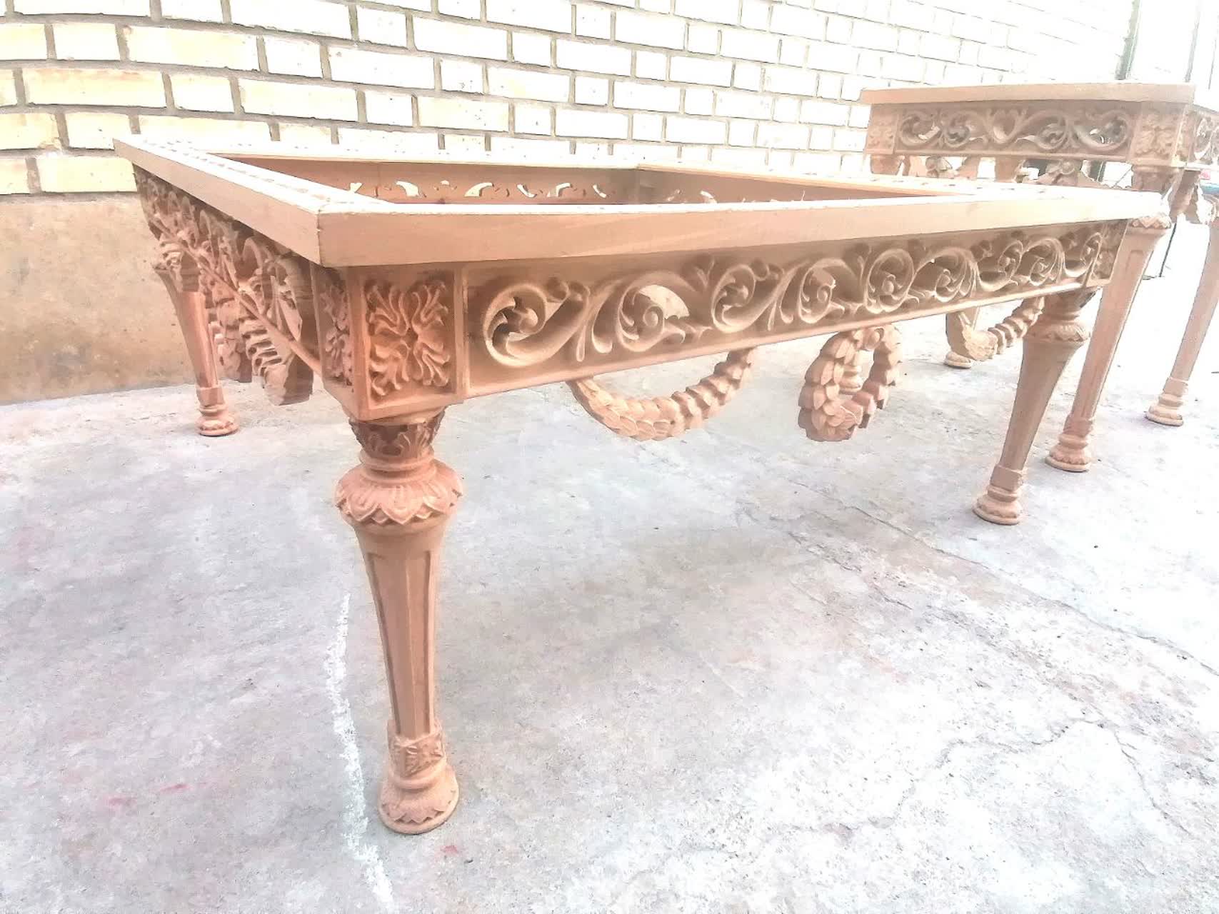 العربية: طاولة جلو مبلي (قهوة) موديل شاهان من ماهون جوب. مصنوعة بالكامل من خشب الزان مع نقوش منبتة يدوياً. يمكن اختيار سطح زجاجي أو خشب MDF. متوفرة للشحن الدولي.
